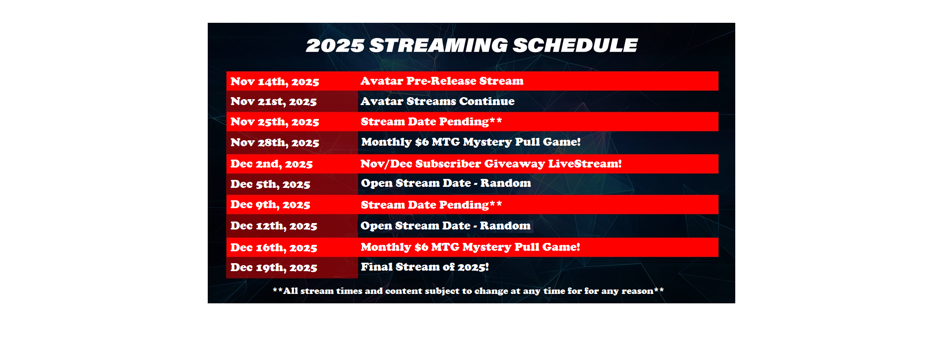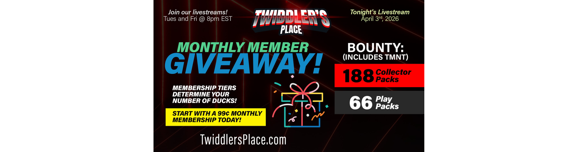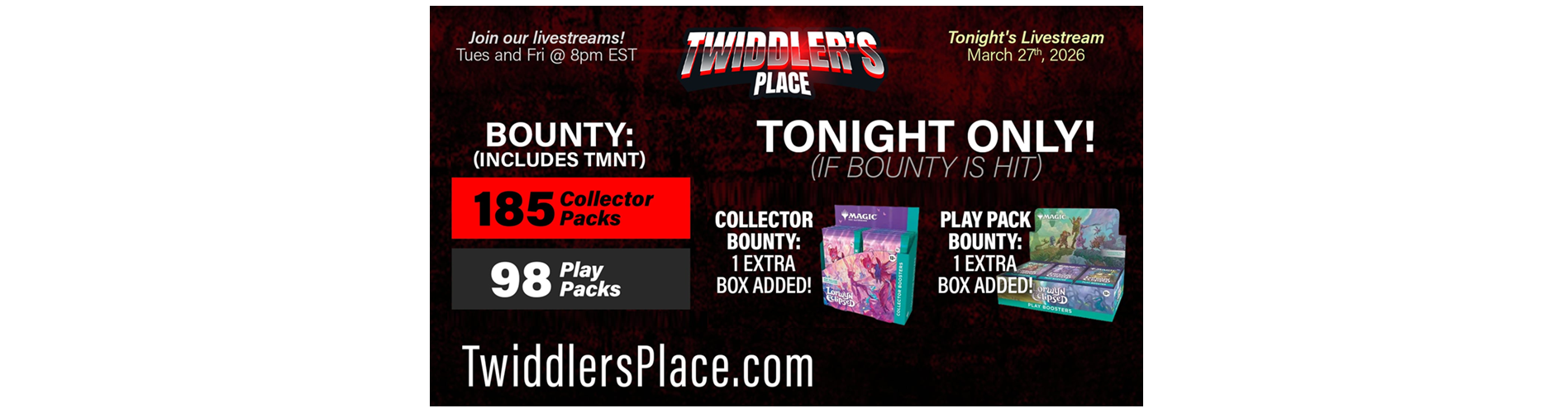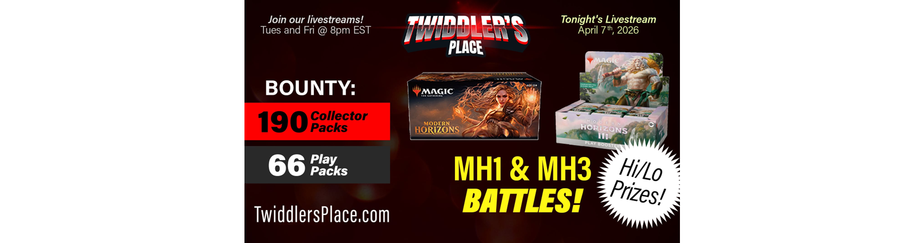 WE NOW CARRY MTG, ONE PIECE, LORCANA & FLESH & BLOOD PRODUCTS! LIVE!! TUESDAY AND FRIDAY NIGHTS @ 8PM EST FOR MYSTERY MTG PULL GAMES, CHAOS PACK GAMES, BOUNTIES, PACK & BOX BATTLES AND STANDARD, RIP 'N' SHIP STREAMS!! GIVEAWAYS - EVERY - STREAM!!